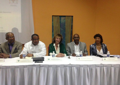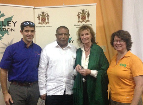 Local and foreign leaders in the emerging cannabis industry met November 13 -14 in Negril Jamaica to discuss first steps and next steps in developing a legal medical marijuana industry. From left to right: Christopher Ramson, Assistant General Manager Chas. E. Ramson Ltd, the Honorable G Anthony Hylton, Minister of Industry, Investment & Commerce, Amanda Feilding, Countess of Wemyss and Director of the Beckley Foundation, and Leigh Coulter, President of GGS Structures Inc.