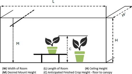 - The dimensions of the grow facility, with the most critical dimensions being the length, width and ceiling height of the space—as well as the anticipated finished crop height. These dimensions will be used to establish the number, spacing and orientation of luminaires required. The anticipated crop height is important in calculating the available distance between the mounted luminaires and the surface of the crop canopy. This distance will determine what luminaire and/or reflector will deliver the optimal performance in that particular application. For a facility with a low ceiling height for example, a low-profile luminaire—that is designed for optimal thermal management—will allow for a greater distance between the light source and the crop. Similarly, a reflector that delivers a wide distribution of light can enable growers to achieve optimum light intensity, evenly across the surface of the crop, with fewer luminaires. Tip: When calculating the anticipated crop height, don’t forget to factor in the bench height.