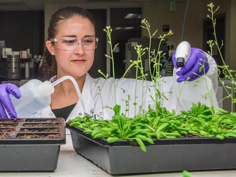 Researcher Christine Shulse tends to Arabidopsis plants in a lab at the DOE Joint Genome Institute (JGI). (Photo credit: Marilyn Chung/Berkeley Lab)