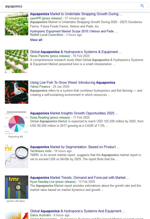 Suppose you're looking for news about aquaponics. The logical thing to do would be to fire up Google News, and typing aquaponics into the search field. You'll then end up with something like this: