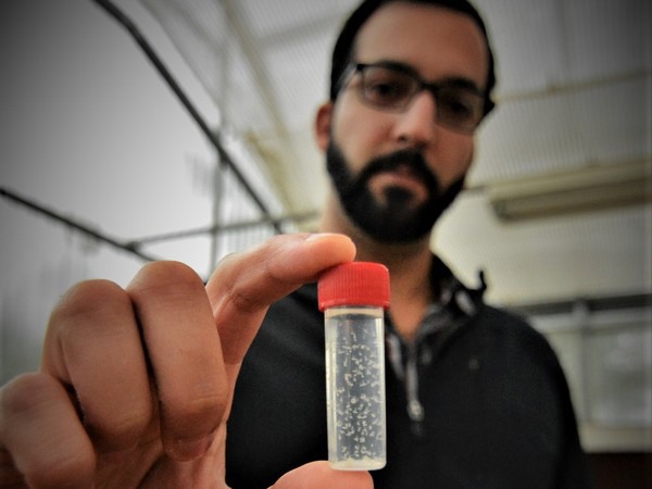 Erfan Vafaie, Texas A&M AgriLife Extension Service entomologist, Overton, holds a vile filled with whiteflies captured during a trial focused on the use of beneficial insects to control whitefly populations. (Texas A&M AgriLife Extension Service photo by Adam Russell)