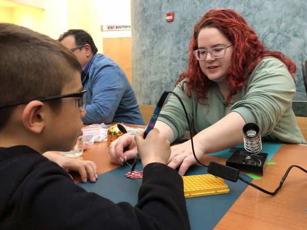 Renee Dale volunteering to teach students about soldering at the Raspberry Pi Jam, the Danforth Center’s annual STEM education outreach event