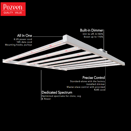 “The Pozeen GLPC is UL, cUL (UL8800 category) and DLC listed and designed for indoor hydroponic cannabis growth,” the team with the company explains. “The GLPC comes with optimized spectra for clone stage, vegetative stage and flowering stage. The fixture is available in 100W, 200W, 320W and 630W which can dim to off (0%) and boost to 110% through the integrated dimmer switch. The fixture can also activate worker-parent process by daisy-chaining all fixtures through provided RJ45 data cord; all fixtures can be synchronized from any of the fixtures in the loop.”