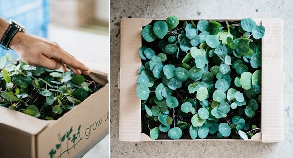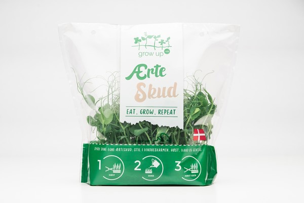 Grow Up FARM has recently launched a new product, named Eat-Grow-Repeat: small pea shoots that grow on a small hemp-square in a bag. "Rip off the upper section of the bag, and the bottom of the bag is now the pot," Lasse Vilmar, Chief Executive Grower of the company, explains. "Place the bottom of the bag with pea plants on your table and the growth will continue. Harvest completely fresh pea sprouts for your salad bowl. Keep watering and within a week they will grow out once again."