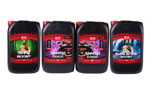 Shogun Fertilisers has released new 10 litre and 25 litre bottles. Samurai Hydro, Samurai Coco, Sumo Boost, and Sumo Active Boost will all be available in the new twenty-five litre size.