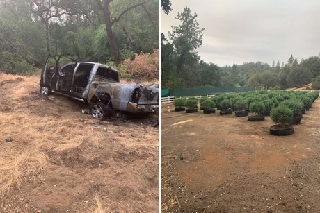 Both Erin Place and the Highway 49 locations bordered the Wolf Creek Class 1 stream. Detectives located three water pumps that were taking water from the stream and feeding large water storage tanks that were used for watering the cannabis gardens. Erin Place had a gas-powered water pump with a 2-inch water hose running from the creek to a storage tank approximately 200 yards away. The water pump, along with four gas containers, were within several feet of the stream. There was also a burnt pickup truck which had caught fire within several yards of the creek.