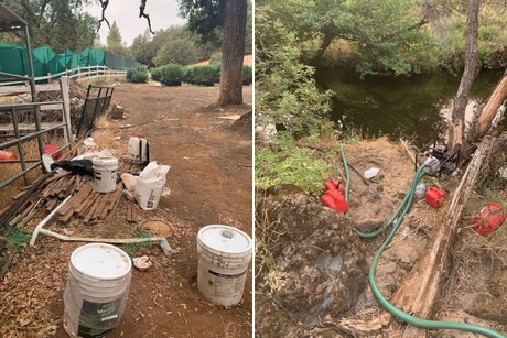 During the search warrant executions, authorities targeted two locations in the 18000 block of Gaston Road — one in the 21000 block of Erin Pace and the other in the 21000 block of Highway 49. During the investigations, dozens of water code, and fish and game code, violations were noted, including discharging waste into waterways, negligent waste discharge requirements, oil and/or petroleum discharge into waterways, illegal water theft/diversion from a public waterway, trash and debris introduced into waterways, and cannabis cultivation within 100 yards of a Class 1 stream.
