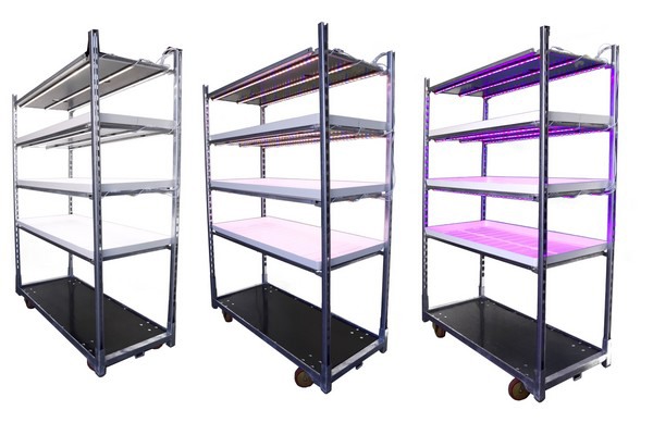 Danish trolleys fitted with three different spectra: cool white, natural indoor, and purple indoor.