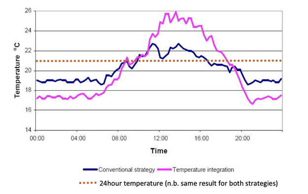 Employing a TI strategy, we target the 24t sum and in a more sophisticated scenario, a grower may deliver the following example temperature profile with TI compared to a conventional strategy