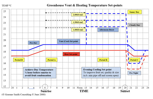 Conventional greenhouse control systems normally allow for a wide range of time periods over a typical 24hour day, with many allowing ramping up and down into and out of these periods and their target setpoints can be influenced by many variables to steer our crops for enhanced yield, quality and produce uniformity. "However in a challenging paradigm of increasing energy costs, we should turn to the basic crop production principles on the integration of plant physiology (how crops grow and what affects their growth), with environmental management: a growth blueprint."