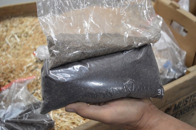 The top bag contains dirt, removed by the new machine. The bottom one is clean seed, sorted into one color.