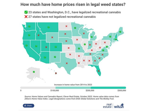 Home values in states with recreational cannabis have outpaced home values in other states by $48,983 over the past decade, according to new research from Real Estate Witch, an online publication owned by Clever Real Estate that connects readers with expert real estate advice, and Leafly, a leading online cannabis discovery marketplace and resource for cannabis consumers.