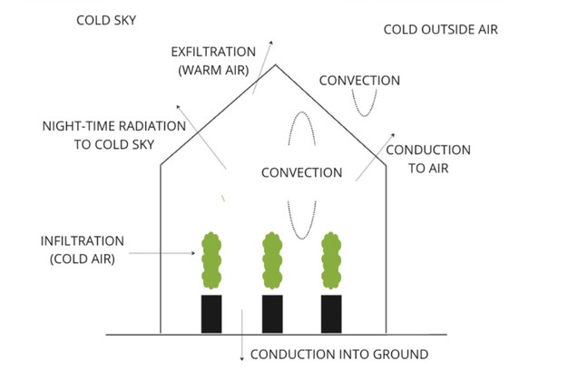 Convection. "This is when the crop is surrounded by cooler air. This can be caused when cold air infiltrates, or warm air exfiltrates from the greenhouse."