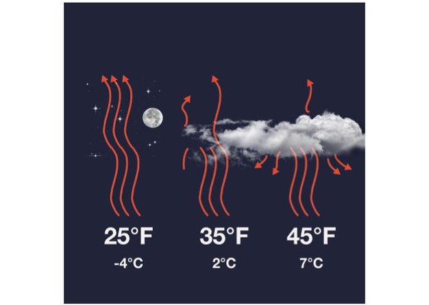 "I'm not sure that any of us go around thinking that after a 30°C (86°F) day, a crop could be plummeting near to 0°C because the clouds parted to reveal a clear and open night sky", he adds. "The physics of radiative heat loss was described by physicists Stefan and Boltzman in the 1880s. They explain why soldiers who had dealt with 40°C (+100°F) and clear skies by day in the first Gulf War woke up in the desert to find ice on their sleeping bags. They were radiating their warmth away to the next closest object: space. "