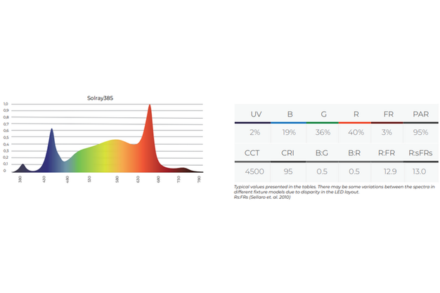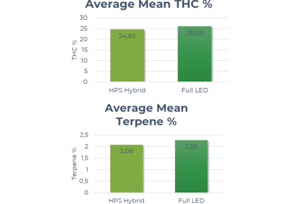 A comparative trial between Valoya LED Solray385 vs. HPS Hybrid setup with 24 different cannabis chemovars in North America showed similar results: