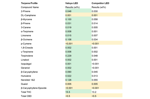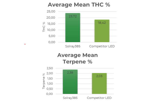 A trial with 40 different chemovars conducted on Solray385 in North America showed a significant increase in both THC and terpene concentrations in comparison to a competitor LED focused in cannabis production: