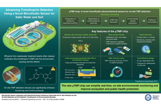 Professor Tae Yoon Lee and Dr. Natarajan Karikalan of Chungnam National University, Korea, have made an advancement in EC detection methods, that show potential to change on-site testing for TMP in contaminated wastewater. They developed a disposable microfluidic lab-on-a-chip (LOC) EC sensor, μTMP-chip, designed for real-time TMP detection. "Efficient TMP monitoring in effluents is critical for effective control protocols. Hence, we aimed to enable in situ testing of water samples," explains Prof. Lee. Their paper was made available online on September 21, 2024, and was published in Volume 499 of Chemical Engineering Journal on November 1, 2024.