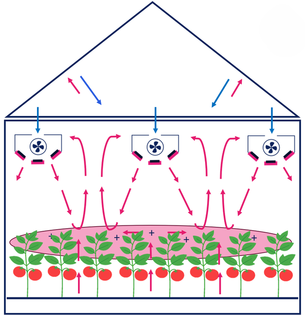 LEDFan® provides a unique solution by integrating lighting with targeted air circulation. It creates controlled airflow while raising canopy air temperature, naturally regulating humidity and reducing cold-heat stress by warming incoming air. This integrated approach supports enhanced CO₂ uptake, photosynthesis, and transpiration, while lowering pathogen pressure through precise climate management.