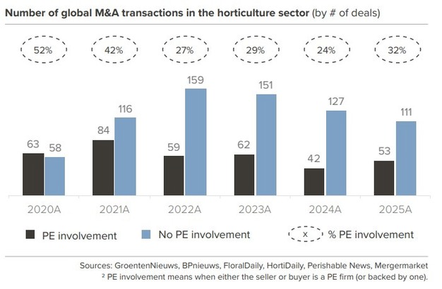 The COVID-19 period — first boosting floriculture and then driving a sharp correction — disproved earlier assumptions of structural stability. The subsequent energy crisis further exposed the vulnerability of the entire horticultural industry, with many companies directly or indirectly impacted by high gas prices. After this period of caution, PE investors are now turning back to the horticulture sector. Both ornamental and edible segments are seeing renewed interest. Deal data reflects this trend: after PE involvement declined from 52% in 2020 to ~25% between 2022 and 2024, it has begun to recover, reaching 32% in 2025, signaling renewed confidence in the sector's fundamentals.