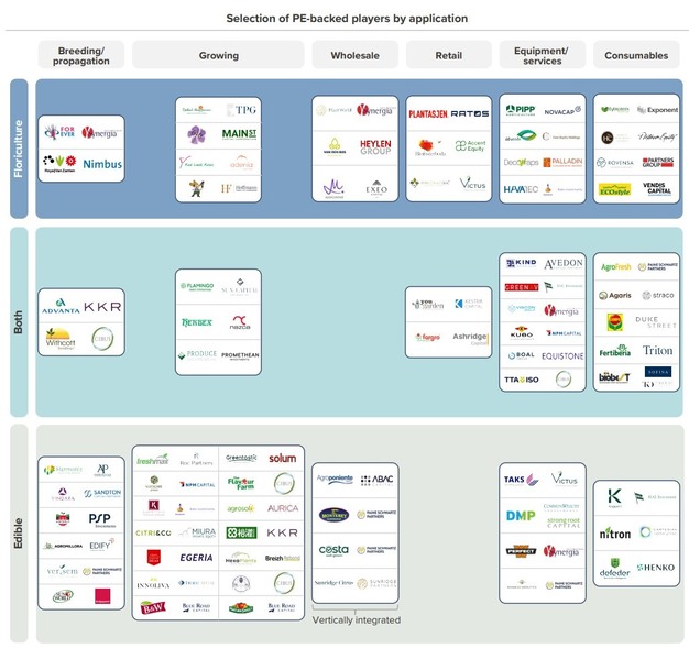 Complementing individual case studies, a broader market perspective highlights a selection of PE-backed players across the horticultural value chain, categorized by application. This mapping demonstrates where financial sponsors are currently positioned and how their activity spans breeding, growing, wholesale, retail, equipment, services, and consumables.