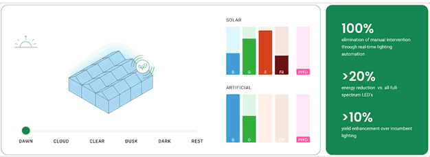 The control logic adapts to different locations and production contexts. Whether in northern regions with limited daylight or southern regions with high solar radiation, the platform adjusts lighting based on real-time conditions. "On a sunny day or a cloudy day, the algorithm provides only the light that can be used by the plant," James says.