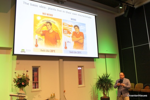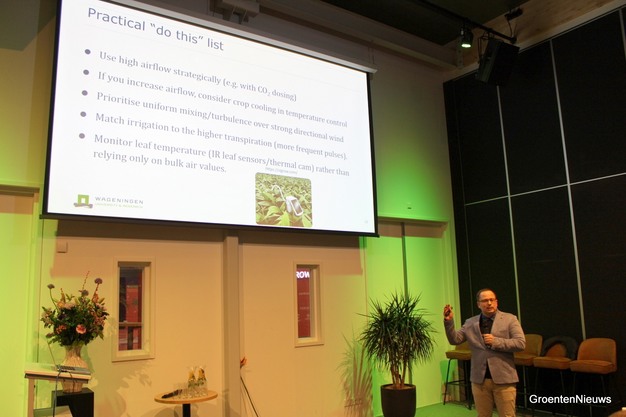 The assistant professor from Wageningen University & Research calls on the audience to start using air movement as a control tool in cultivation. You should use air movement tactically, for example by properly distributing the CO₂ that growers dose through the greenhouse.