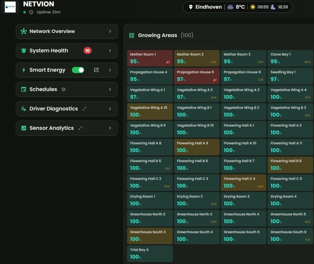 Netvion, based in Eindhoven, has built a platform that connects directly to the LED drivers and sensors already installed in the greenhouse, transforming them into a system that monitors itself, manages energy costs automatically, and explains every decision to the grower in plain language.