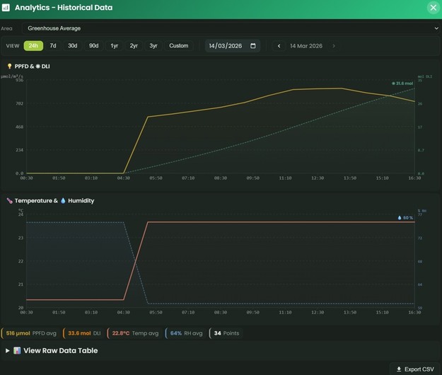 Netvion tracks PPFD continuously across every zone and adjusts supplemental output automatically to keep each zone on its daily target. When natural light falls short, the system compensates by precisely the required amount. When natural light is stronger than expected, it pulls supplemental output back — avoiding unnecessary energy spend.