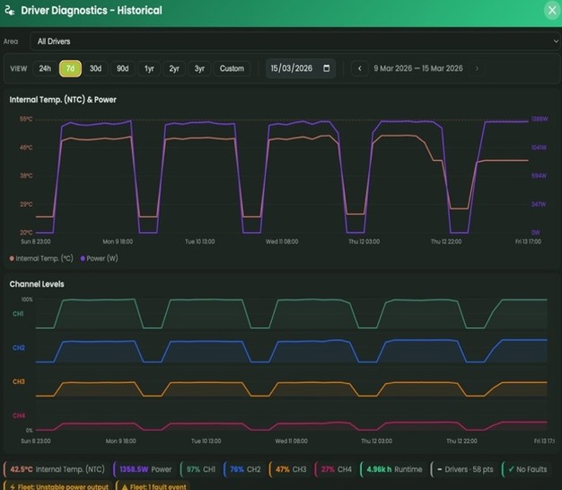 The platform logs internal temperature, output power, per-channel intensity, and fault codes for every driver in the network — continuously, across a rolling three-year history.