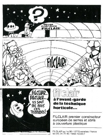 This advertisement, published in horticultural magazines in 1967, perfectly illustrates the company's early spirit of innovation in protecting horticultural and vegetable crops in challenging environments. "Filclair, Filclair — these earthlings must be crazy!" "Filclair — at the forefront of horticultural technology… Filclair, Europe's leading manufacturer of plastic-covered greenhouses and crop shelters."