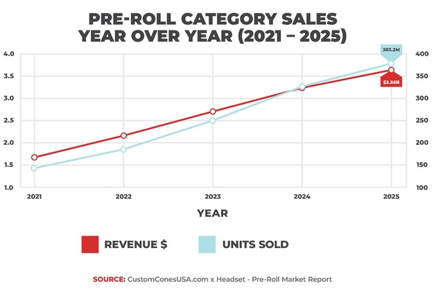 Drawing on 2025 sales data from cannabis analytics firm Headset, along with survey insights from more than 125 of the top pre-roll operators across North America, the report shows the category generated $3.6 billion in revenue and sold more than 383 million units, achieving a 15.9% market share and the strongest growth of any major cannabis category.